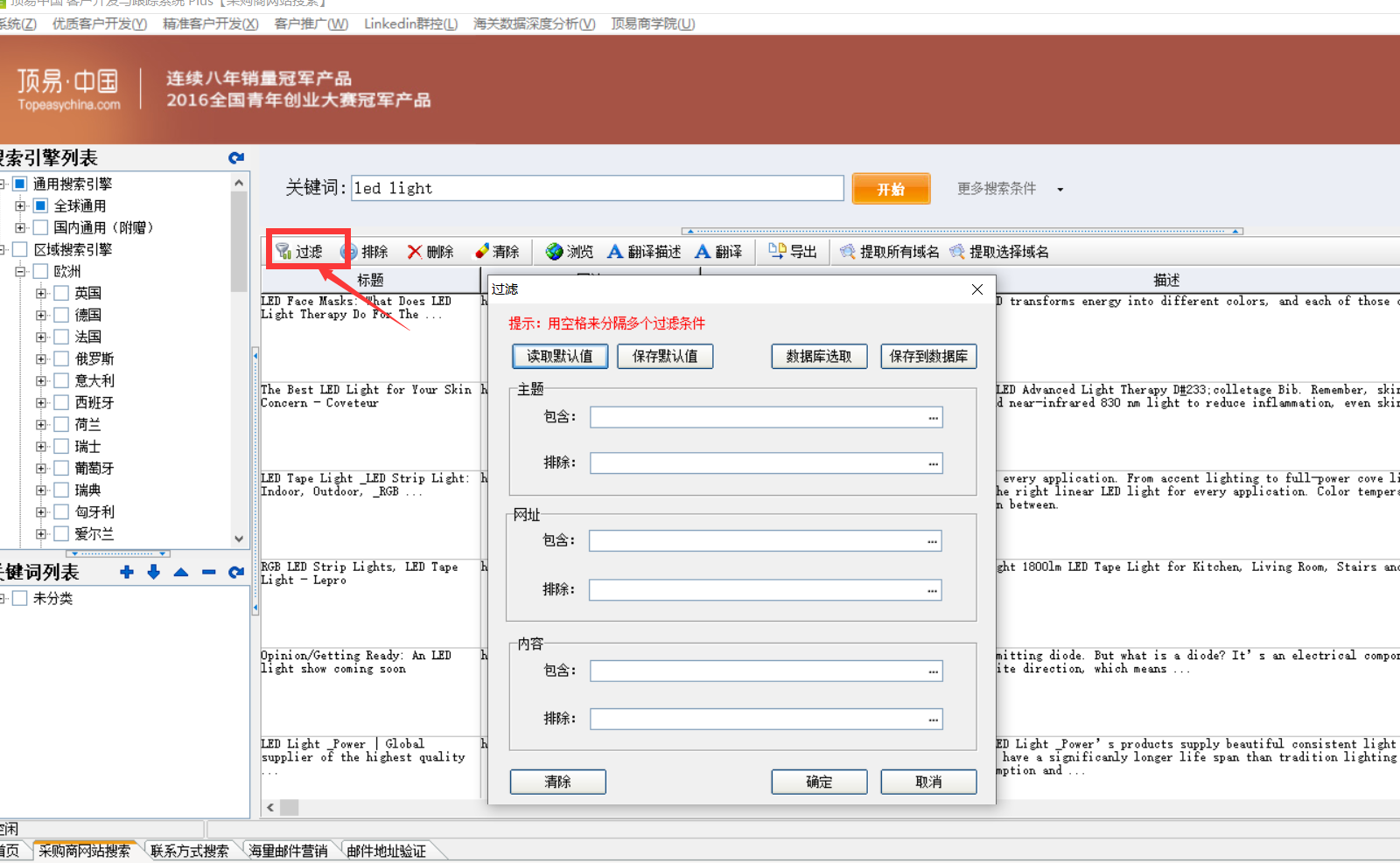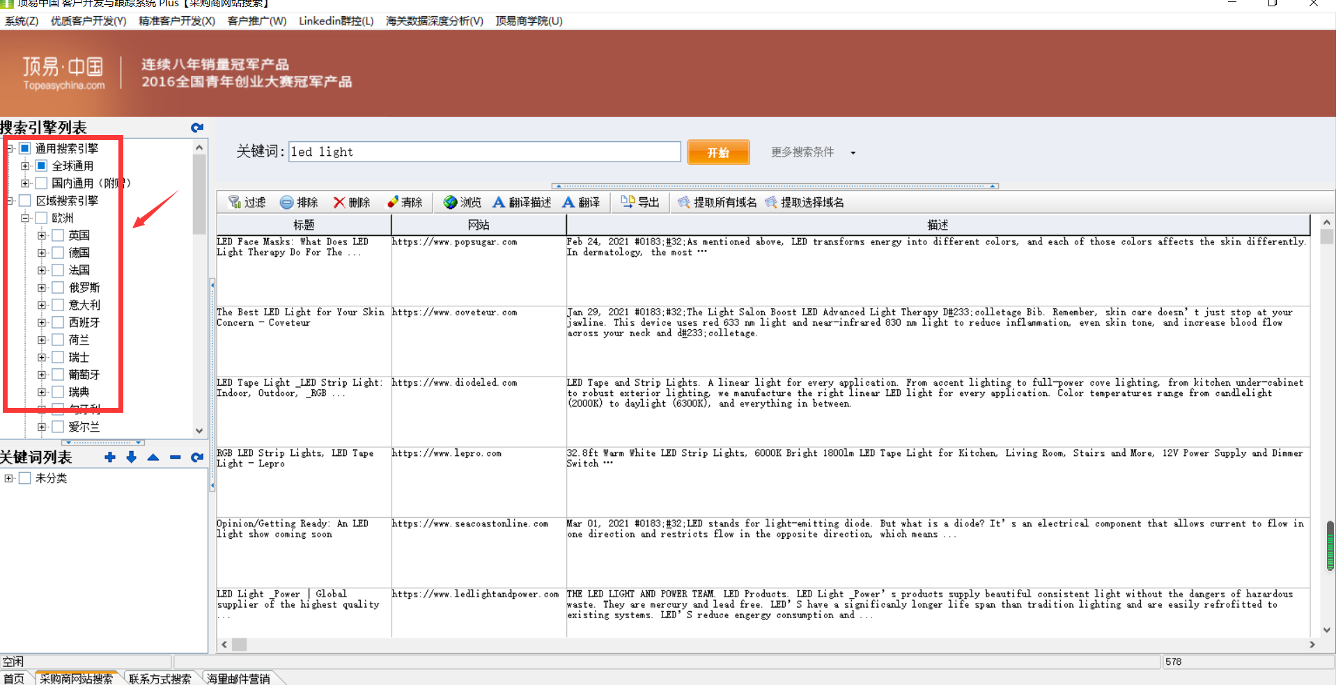 顶易软件可以根据产品关键词、行业关键词、目标客户产品关键词,通过全球各大搜索引擎、国家区域引擎、行业引擎,社交引擎搜索全球潜在商机。